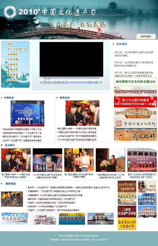 2010年,国家文物局政府网在着力加强政府信息发布、加强年度重点工作报道的同时,进一步丰富了网站信息展示技术手段,对文博行业年度重大事件进行网络直播,提高信息的时效性、可看性,给社会公众以更直观、更具体的感受。在2010年中国博物馆日、中国文化遗产日期间,为迎接文化遗产领域的重大主题日的到来,彰显我国文化遗产风采,弘扬文化遗产保护精神,国家文物局政府网站分别推出“5•18相约广州 关注博物馆”的博物馆日专题及“2010年中国文化遗产日”专题。专题对全国各地开展的文化遗产宣传活动进行全景式记录,并增设“在线直播”栏目,通过在线视频全程同步直播方式、结合自采新闻和收集各方信息等图文直播形式,将活动实况直播上网,快速、全面、直观、生动的报道了文化遗产纪念日期间活动盛况。